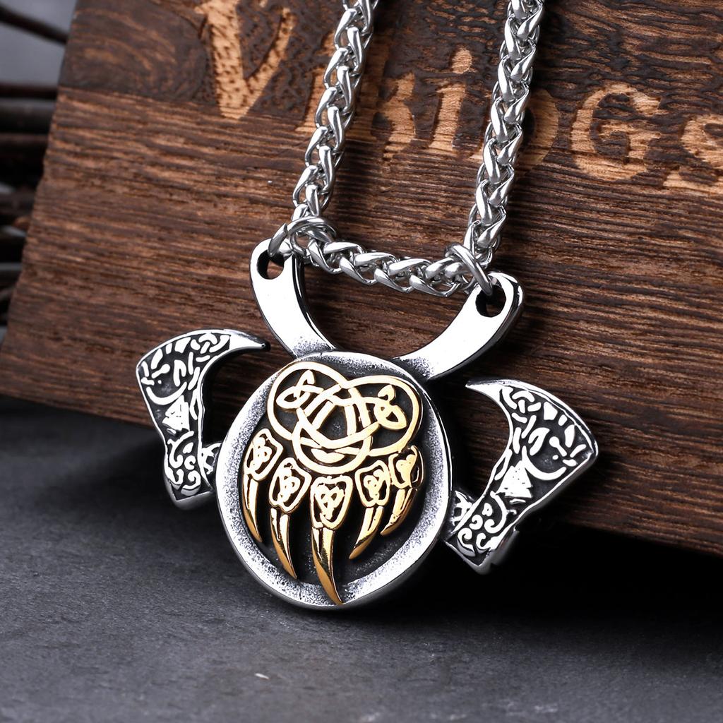 Stainless Steel Viking Bear Claw Axe Necklace Mens Nordic Amulet Pendant Vintage Jewelry Gift for Men