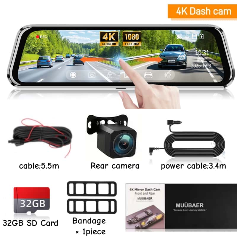 4K Front and Rear Mirror Dash Cam, 9.66" IPS Touch Screen Dual Cameras, Loop Recording, G-Sensor, Parking Assistance, Backup Cam