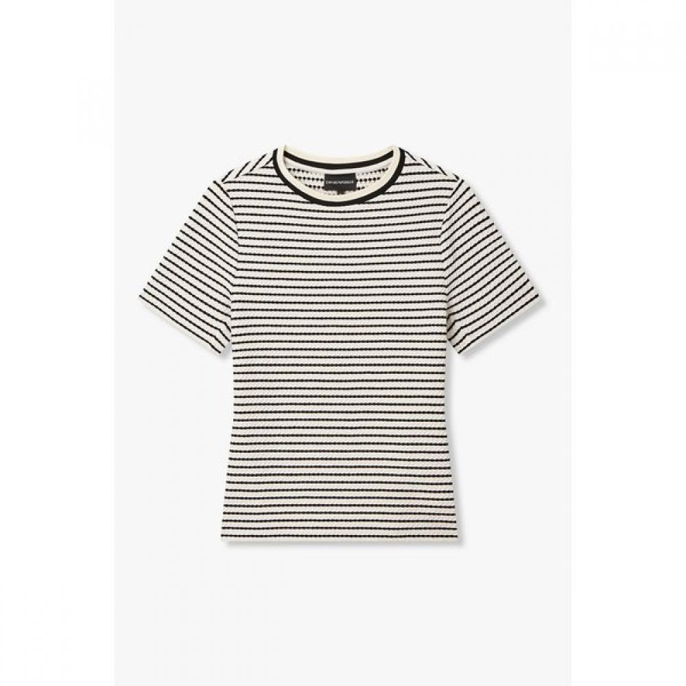 The 26 S/S Women's Stripe Short Sleeve T-shirt A526126512 is an item that can be styled trendily with bootcut pants or skirts. Made from a cotton blend material, it features a short sleeve design and a striking stripe pattern. The rib knit crew neck is a highlight, making it a highly versatile product.