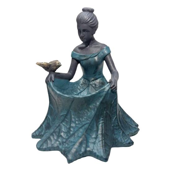 This exquisite bird feeder combines sturdy, lightweight, and weather-resistant resin craftsmanship with a unique design featuring a garden fairy holding the feeder. Finished in a bright brushed bronze effect, it adds a charming blend of traditional and modern style to any outdoor space.