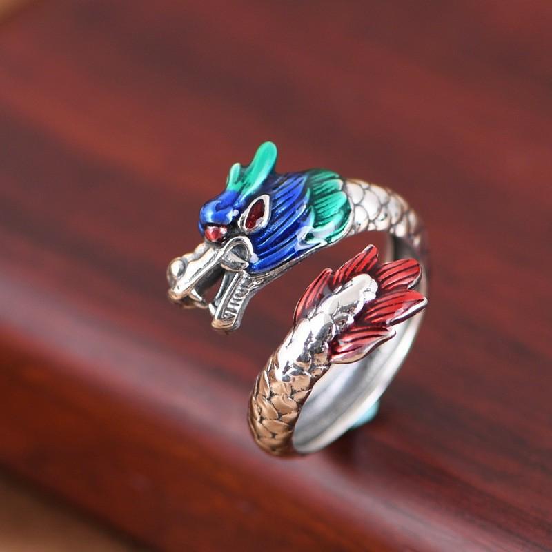 925 Retro Style Dragon & Phoenix Enamel Ring: Unisex, Artistic, Open Index Finger Design
