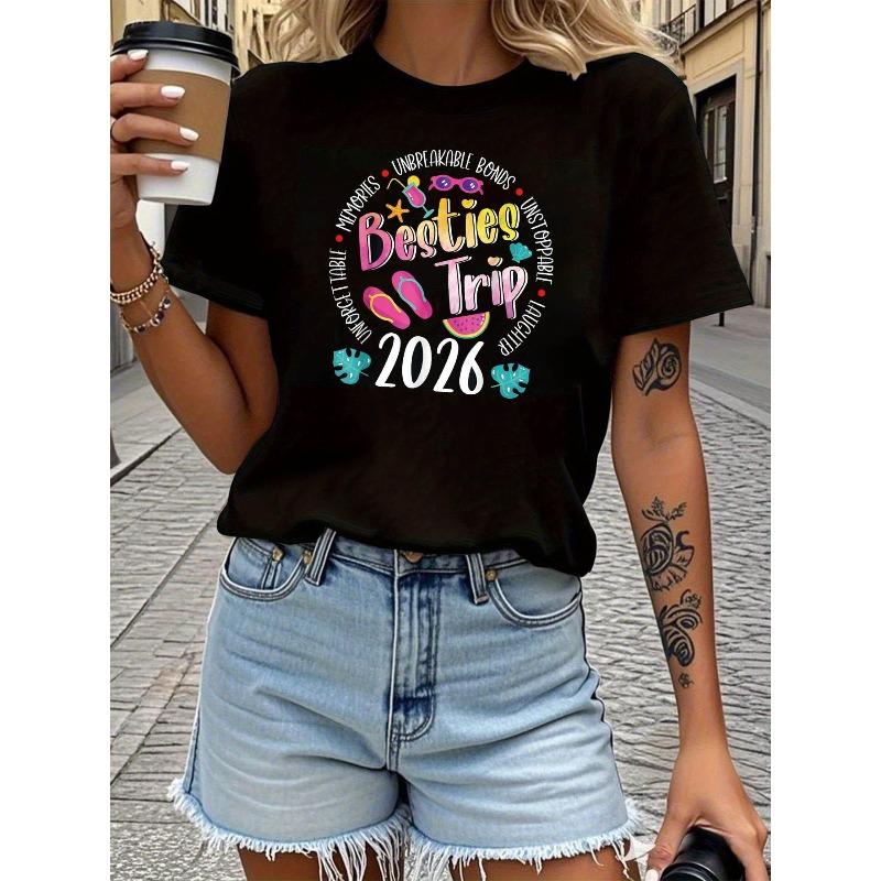 Women's Besties Trip Letter Print Tee Short Sleeve Crew Neck Casual Regular Fit Top