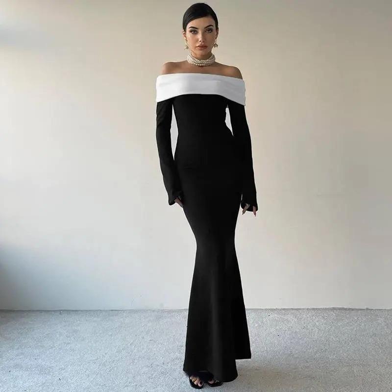 Abito Lungo da Sera da Donna Bicolore Mermaid con Spalle Scoperte, Manica Lunga e Spalline Sottili