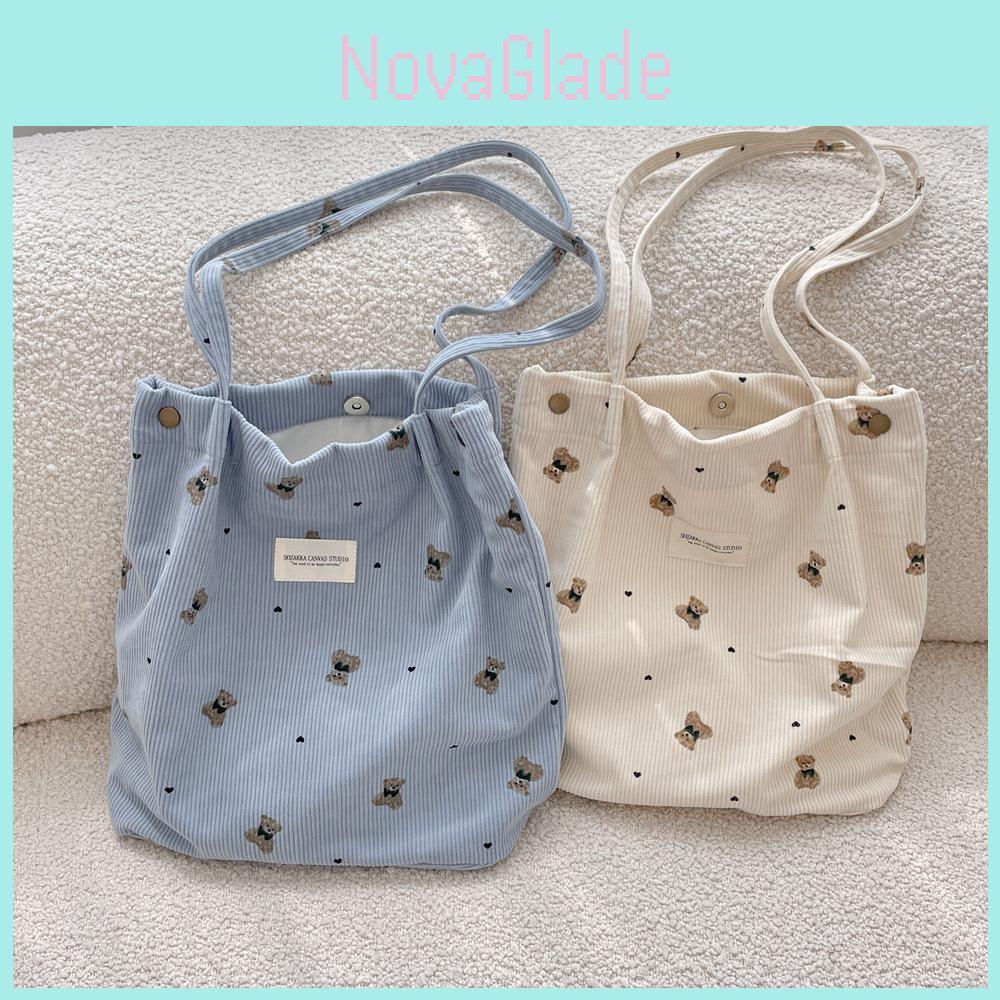 Adorable Corduroy Bear Print Canvas Tote Bag Spacious Soft Shoulder Bag For Students
