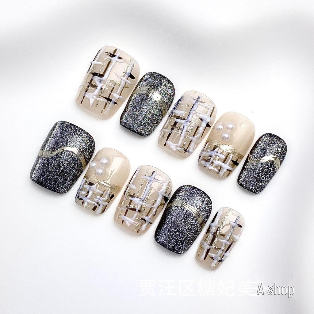 Tang Fei 3D Cat Eye Black Fragrance Nail Art - Pure Handmade, Wearable, Mirror Powder, Super Short Ladder Style