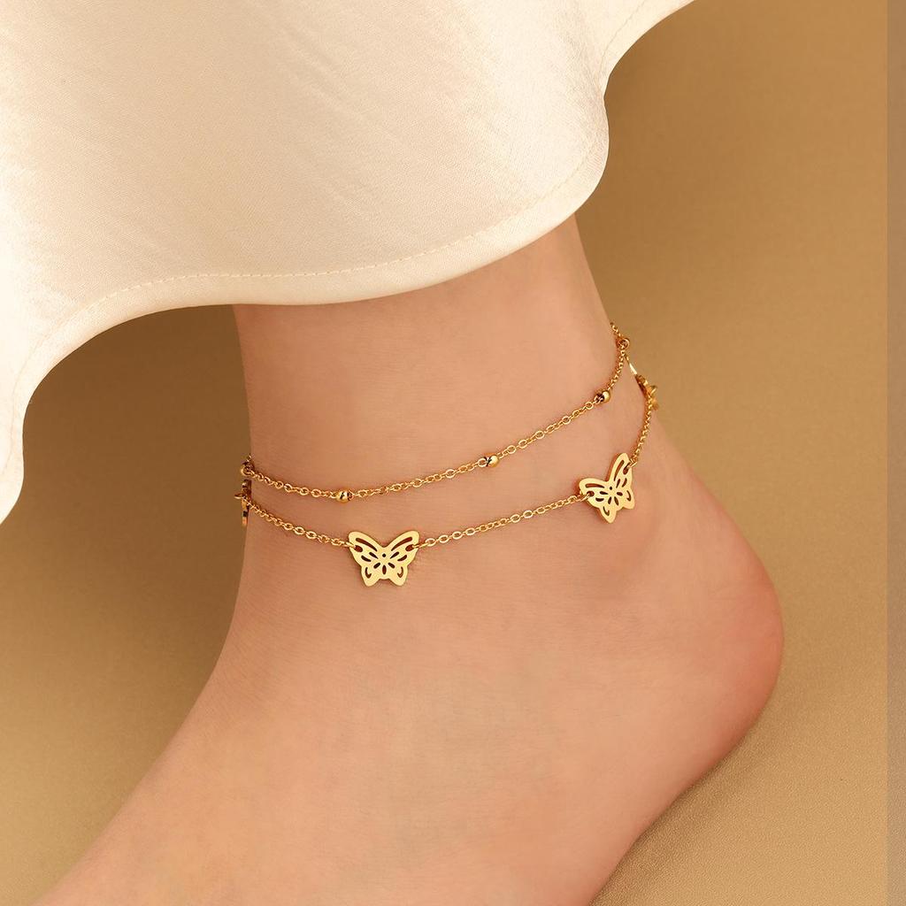 Korean INS-Style Double-Layer Butterfly Anklet for Women, Personalized Titanium Steel Gold-Plated Summer Design