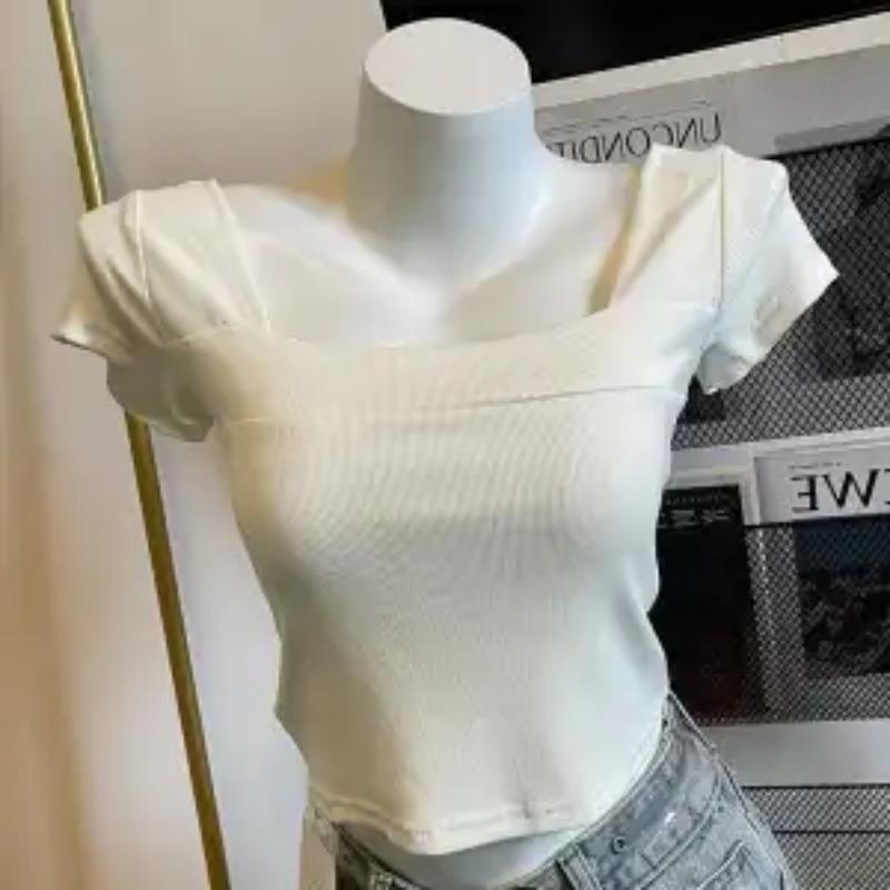 Women's Elegant Square Neck Ribbed Short Sleeve Cropped Blouse