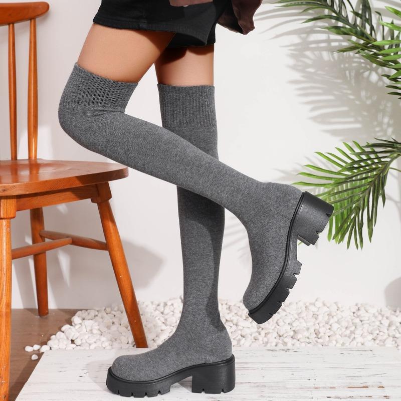 Knitted Stretch Boots Fashion Round Toe Breathable Sleeve Platform Non-Slip Block Heel Skinny Boots