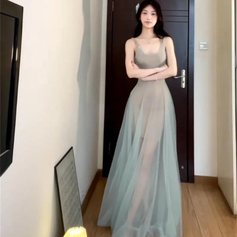 Elegant Summer Spaghetti Strap Dress: Slimming, Color-Blocked Mesh Design for a Unique, Sophisticated Look