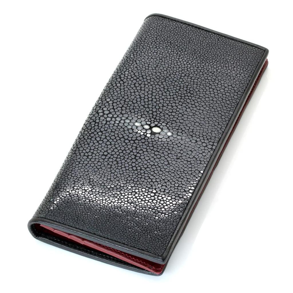 [Revetta] Stingray Leather Long Wallet, Slim Wallet, Wine Red Leather Interior, Galusha (Stingray) Leather, Black, Men's, with Coin Pocket, Genuine Le