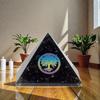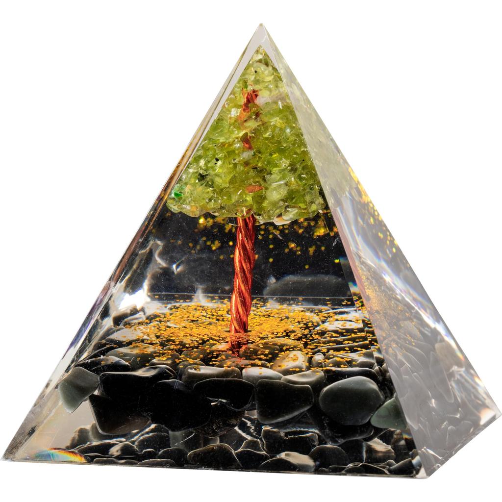 [Orgonite Pyramid Specifications] • Pyramid base: 6cm x 6cm • Pyramid height: 6cm • Sacred geometric pattern: Tree of Life • Natural stone chips used: Peridot (green) • Natural stone chips used: Obsidian (black) • Material: Epoxy resin • Box size: 8.6cm x 7cm x 6.8cm