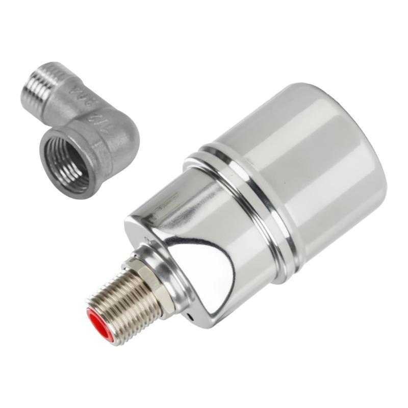 The integrated floating ball mechanism activates precise water flows regulation across 1/2" to 1" pipes, supported by three threaded adapters and a 90° elbow for flexible installation in diverse plumbing configurations.