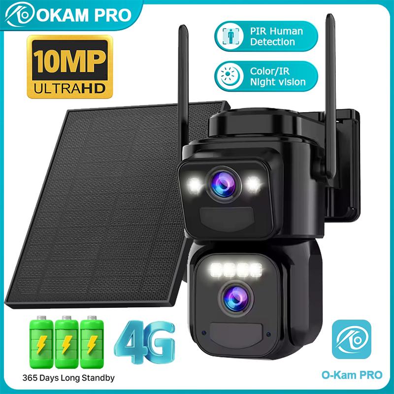 OKAM PRO Security Solar Camera Dual Lens HD 10MP 4G SIM Camera PIR Motion Detection Two-way Intercom Night Vision Outdoor Camera