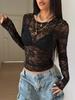 Black Crochet Lace Sheer Sexy Round Neck Slim Flattering Top Women Fashion Daily Basic Office Lady Casual Slim Fit Ladies Elegant Long Sleeve Top