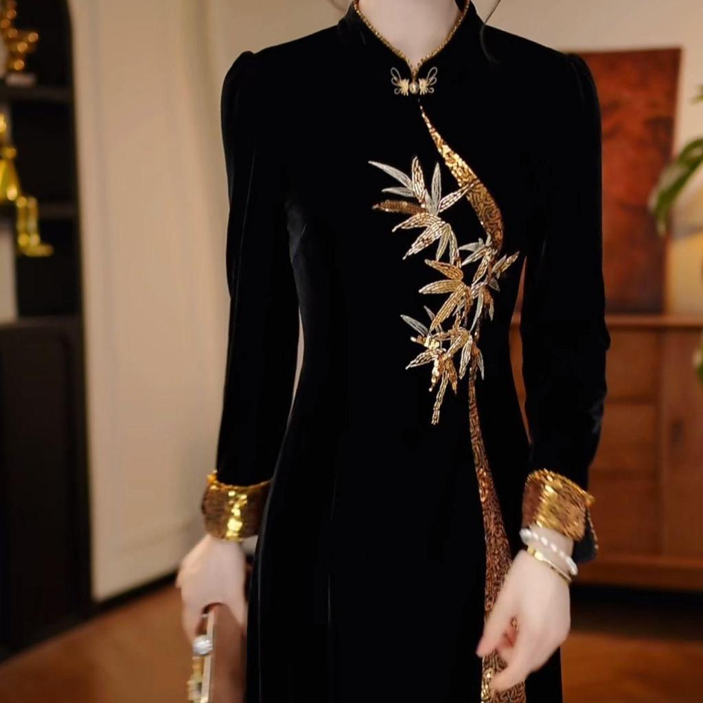 Elegant Winter 2026 Chinese Velvet Qipao Dress - Slimming Mid-Length Skirt