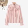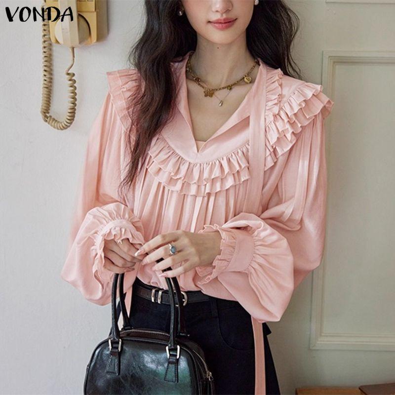 VONDA Elegant Women Bows Tie Ruffled Loose Casual Long Sleeve Blouse