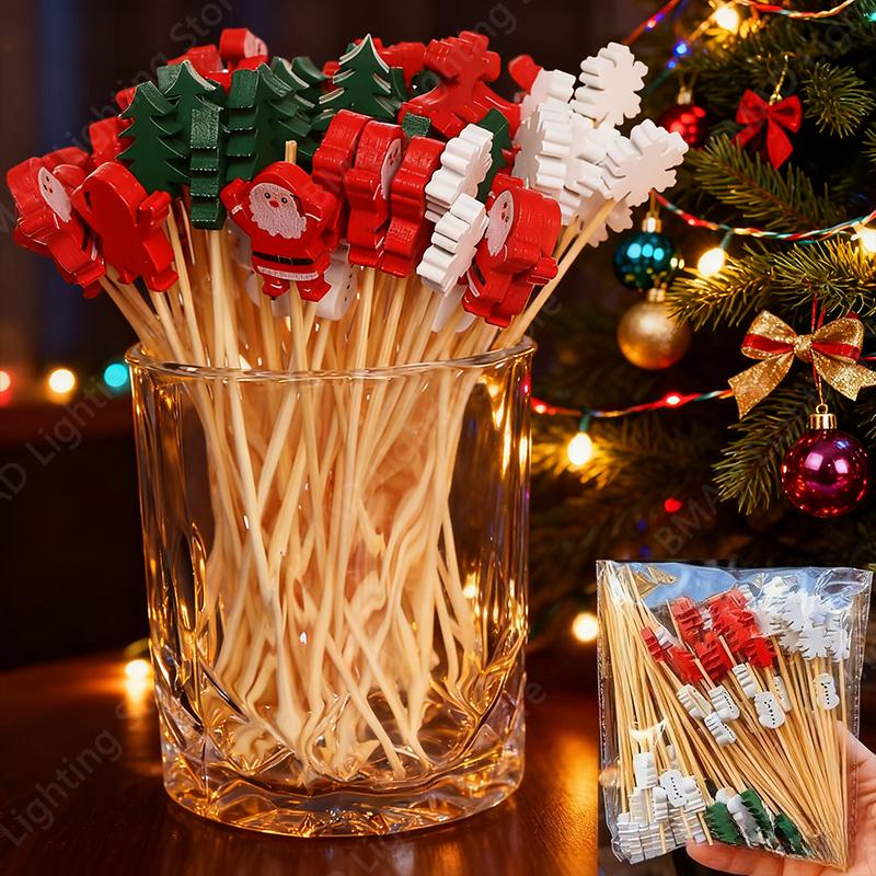 50/100Pcs Christmas Fruit Bamboo Skewers Santa Snowflake Tree Designs Disposable Bamboo Skewers for Party Dessert Cocktail Decor
