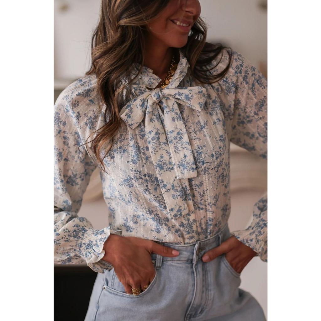 Women's Spring Summer New Floral Print V Neck Tie Long Sleeve Blouse Vacation Style Casual Shirt For Women European American Crossborder