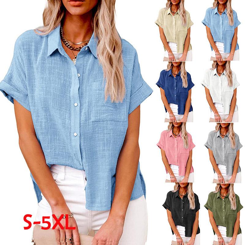 Camicie estive da donna in cotone e lino tinta unita con risvolto manica corta abbottonata camicia bianca blu con tasca irregolare