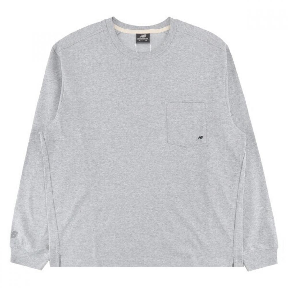 The New Balance GREY Long Sleeve T-Shirt NBNDG11203 AC is designed in a natural melange gray color with a pocket detail. It is versatile in thickness, suitable for use as an inner layer in transitional seasons and as a standalone item in early summer. It combines style and practicality, making it ideal for men's hiking activities. The UNI size fits various body types.