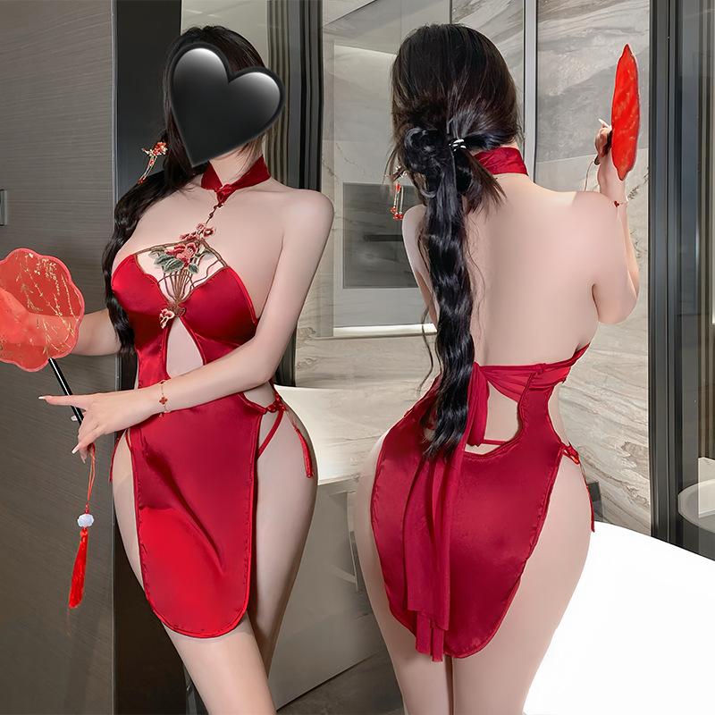 Sex underwear sexy neck hollowed out high waist split cheongsam temptation pajamas short skirt uniform set