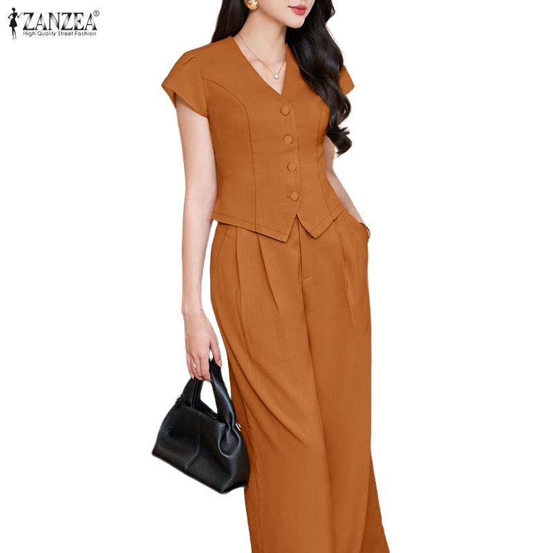 ZANZEA Women Short Sleeve Blouse and Long Pants Casual Two Piece Suit Sets