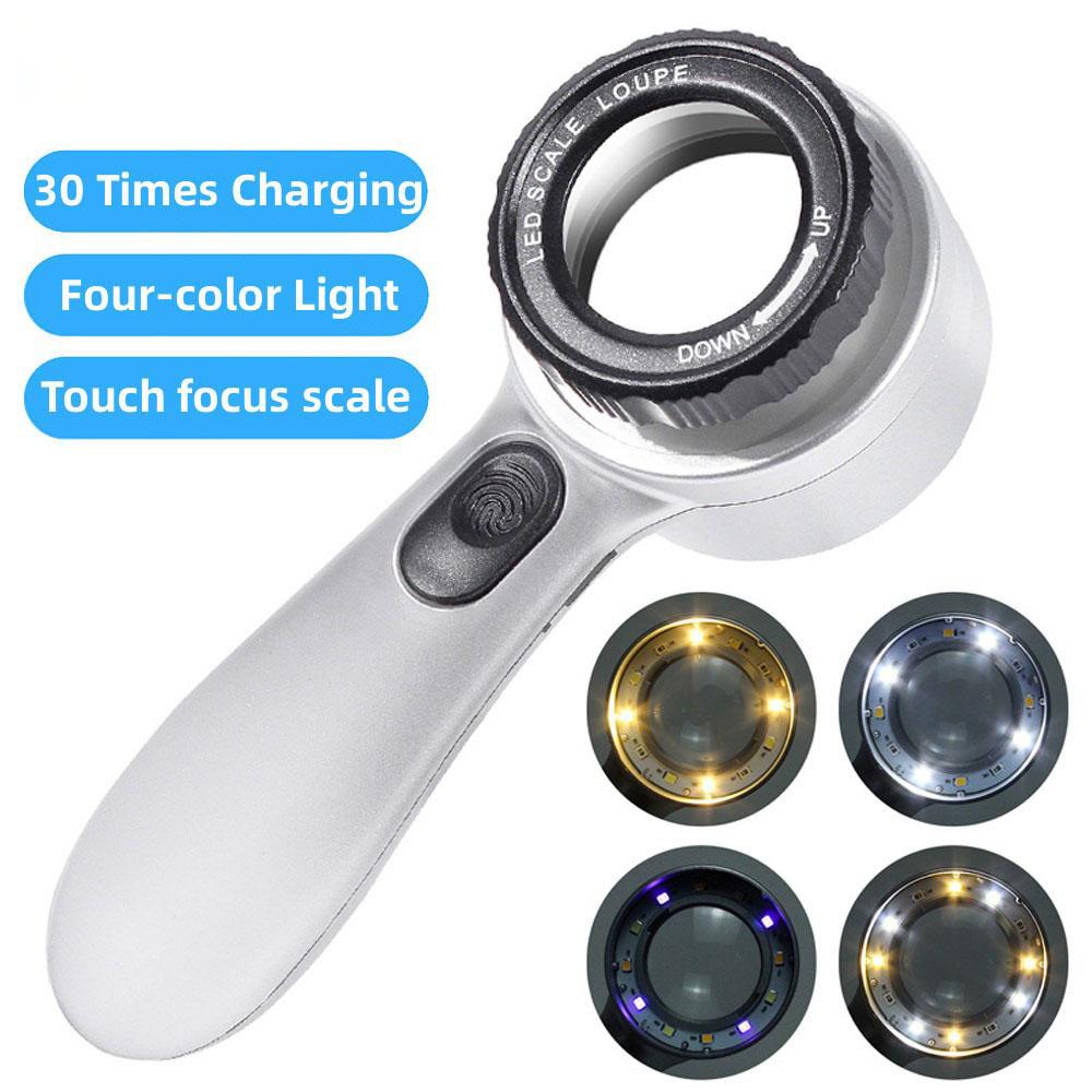 30x Handheld Rechargeable Magnifier With 4-color Led Light For Antiques Jewelry Appreciation Reading Books And Fine Inspection