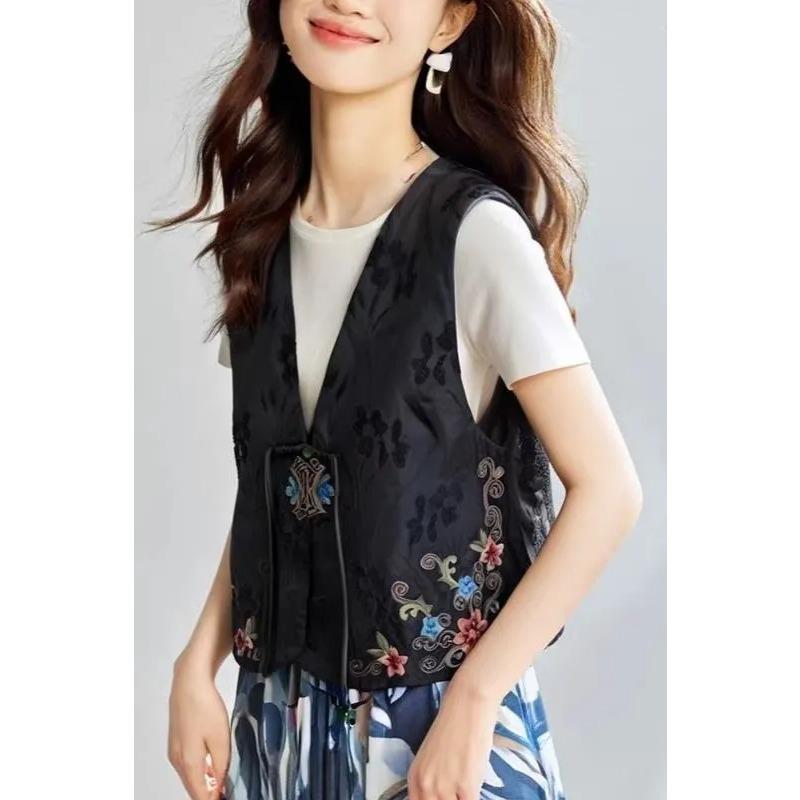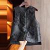Women Black Floral Embroidery Chinese Button Sleeveless Vest