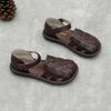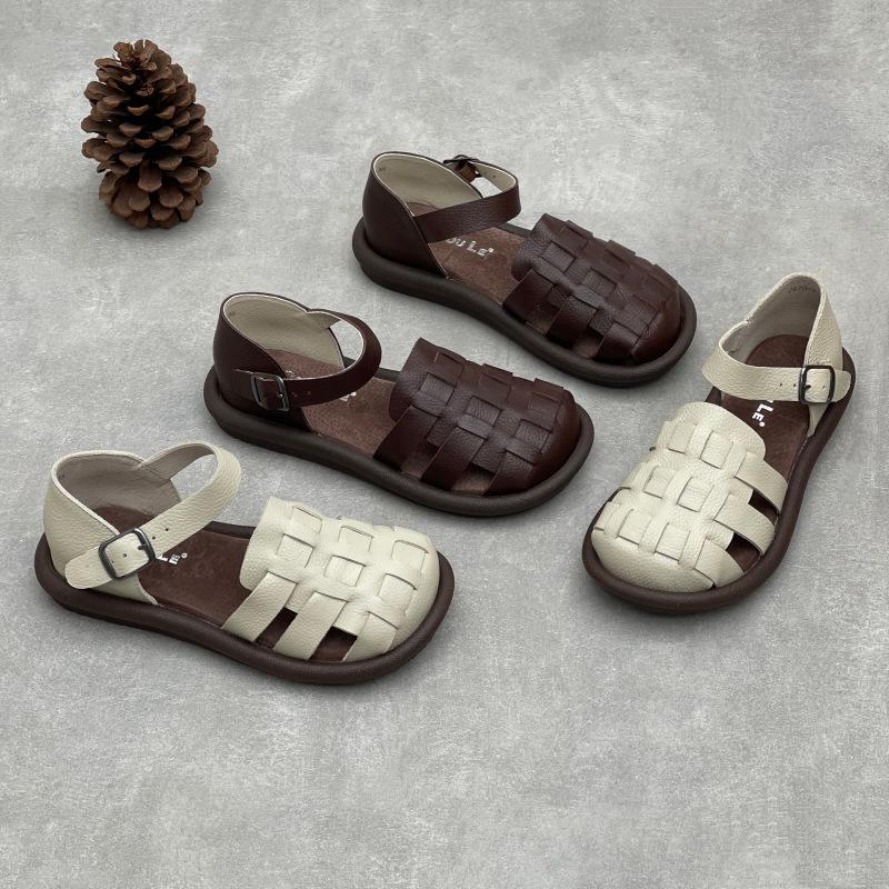 Johnature Soft Cowhide Woven Round Toe Flat Sandals Soft Sole Comfortable Genuine Leather Women's Shoes